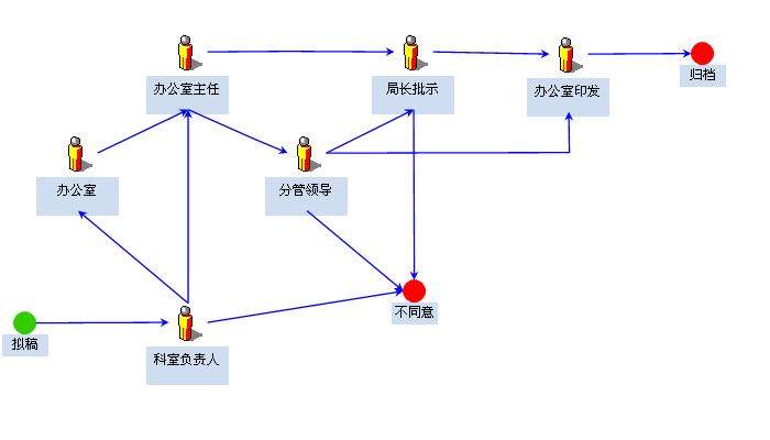 具体流程为:发文拟稿 -> 科室负责人审核 -> 办公室审核 -> 办公室主任审核 -> 局领批示 -> 办公室印发 -> 归档。