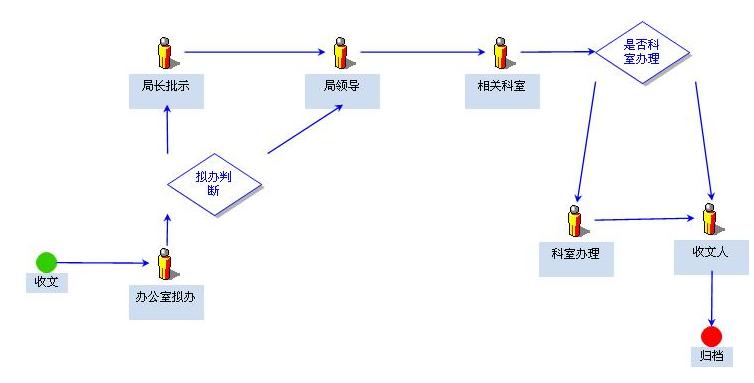 具体流程为:收文人登录->办公室拟办(可选局长或其他多个局领导批示 -> 局领导批示 -> 相关科室负责人 -> 科室传阅与办理 -> 收文人归档,流程结束文档自动归档到OA系统的资料中心库。