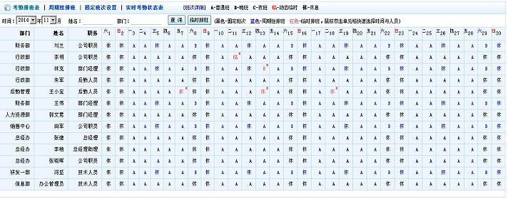 如:员工张三的固定排班是A班,最近两周周期排班是B班,明天的临时排班设置为C班。从今天开始,则张三明天的班次是C班,今天和后天、两周(含今天和后天)以内是B班,两周以后恢复为A班。排班管理主界面如下: