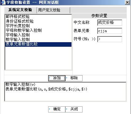 一个表单元素可以使用多个字段校验,以下是表单定制中对某个字段的校验当前元素输入必须为数值,且必须大于成交价格),设置字段属性时点击“字段校验”,操作界面如下: