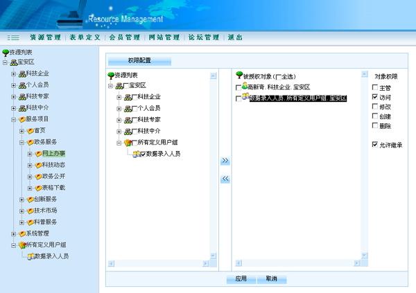 资源管理是应用系统(如:OA、CRM、人事管理、会议管理等)运行基本保障,对组织部门、用户、用户组、服务/栏目等各类资源进行统一的配置和管理,实现用户统一身份管理、统一身份认证、统一权限配置、统一访问控制。